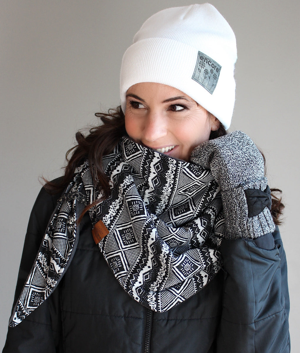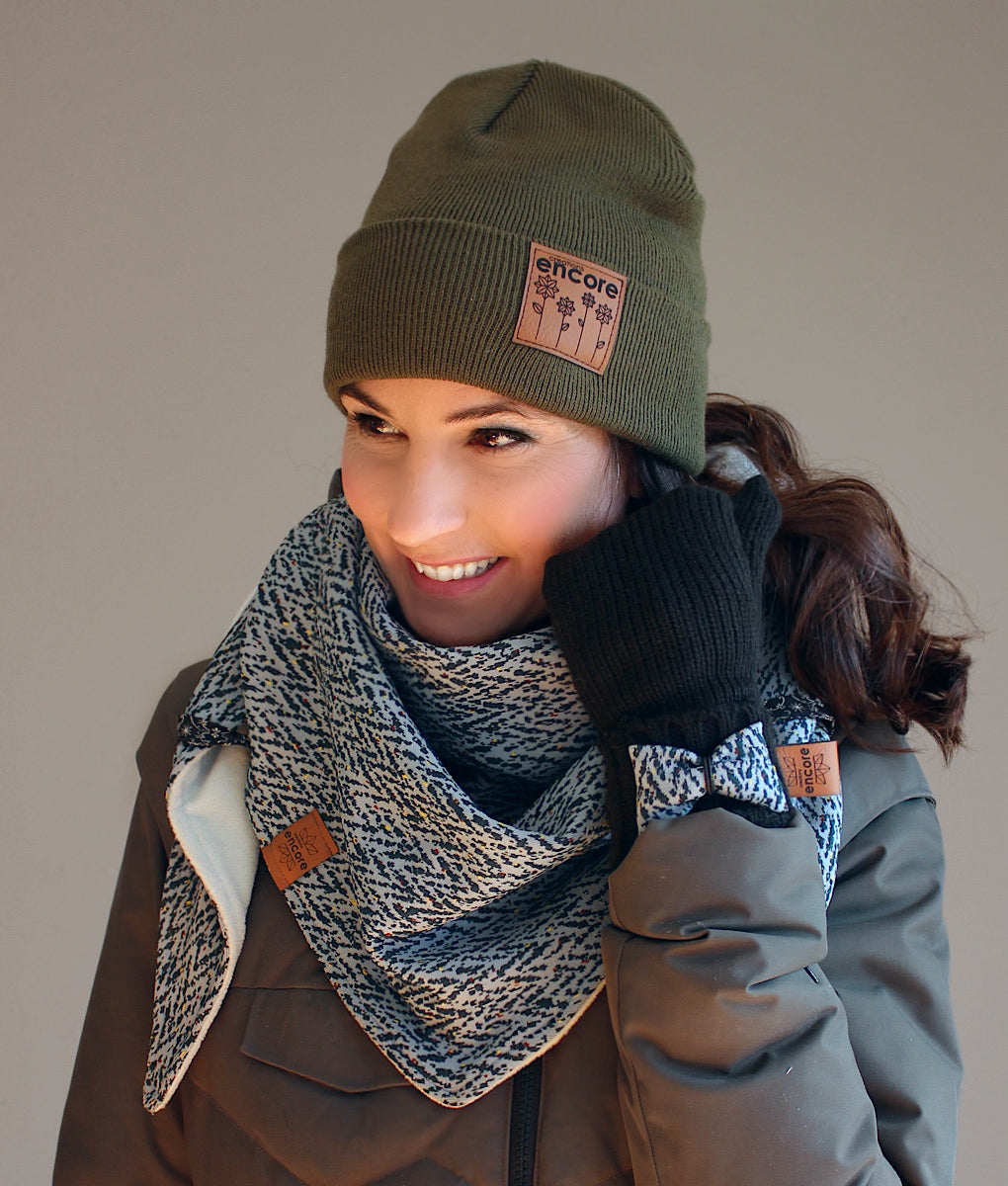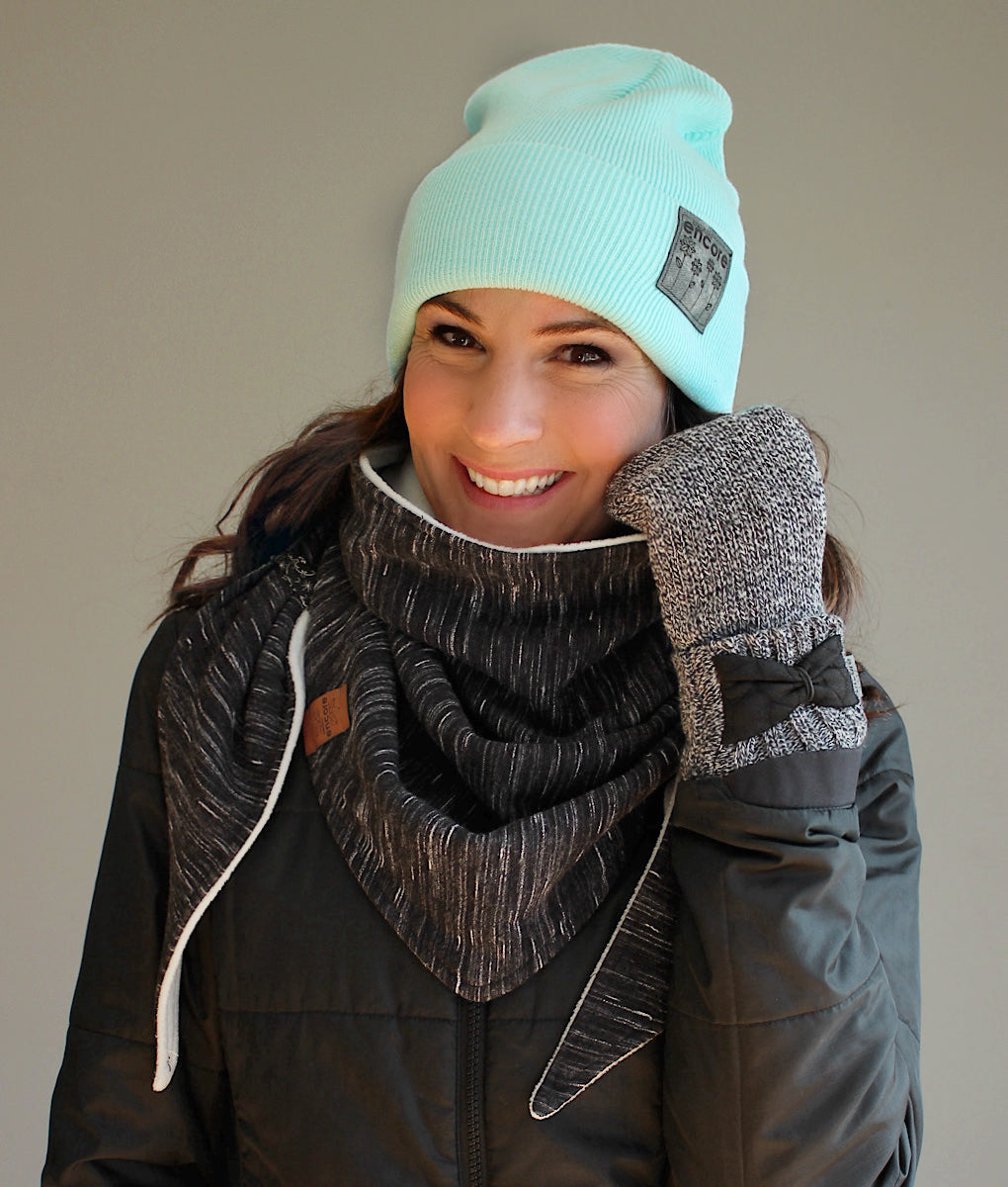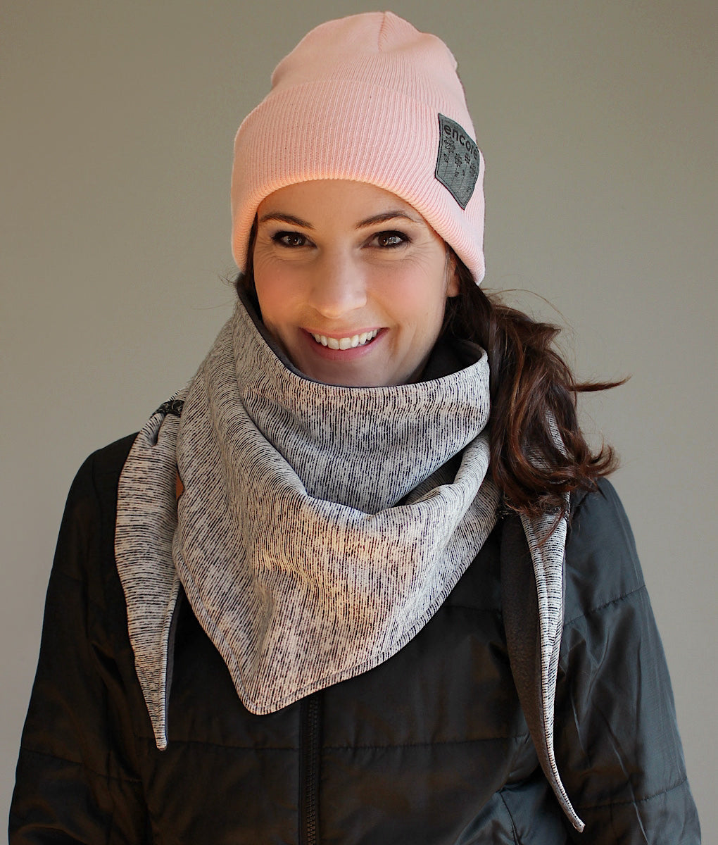 Foulard triangulaire douillet, parfait pour affronter le froid avec style. Entièrement doublé en polar pour une chaleur incomparable, son extérieur en doux tricot lui confère une allure élégante et confortable. Il suffit de croiser les pointes à l’avant et de les glisser dans les petites gances pratiques pour qu’il reste bien en place toute la journée. Un accessoire indispensable pour vous garder bien au chaud cet hiver. La tuque et les mitaines assorties sont disponibles dans la section accessoires.