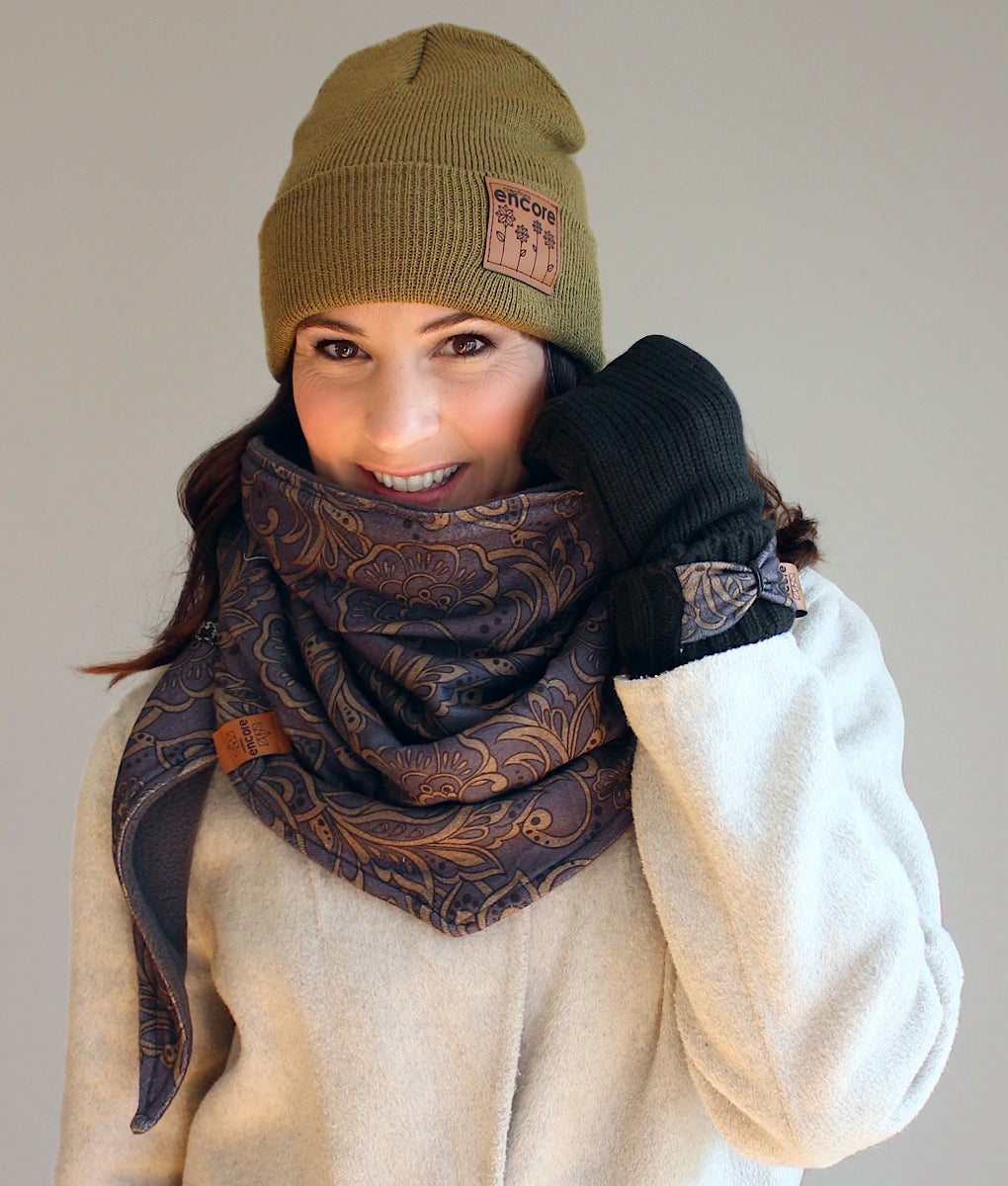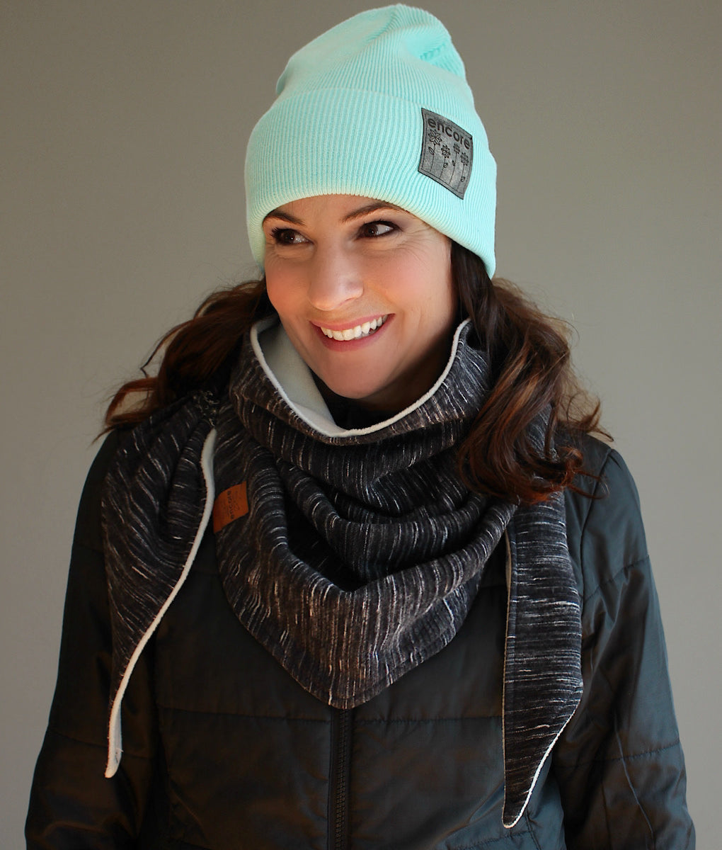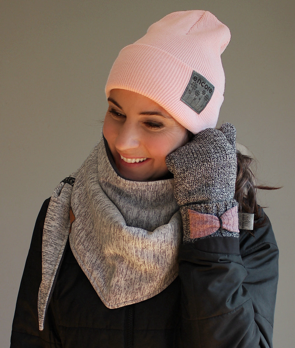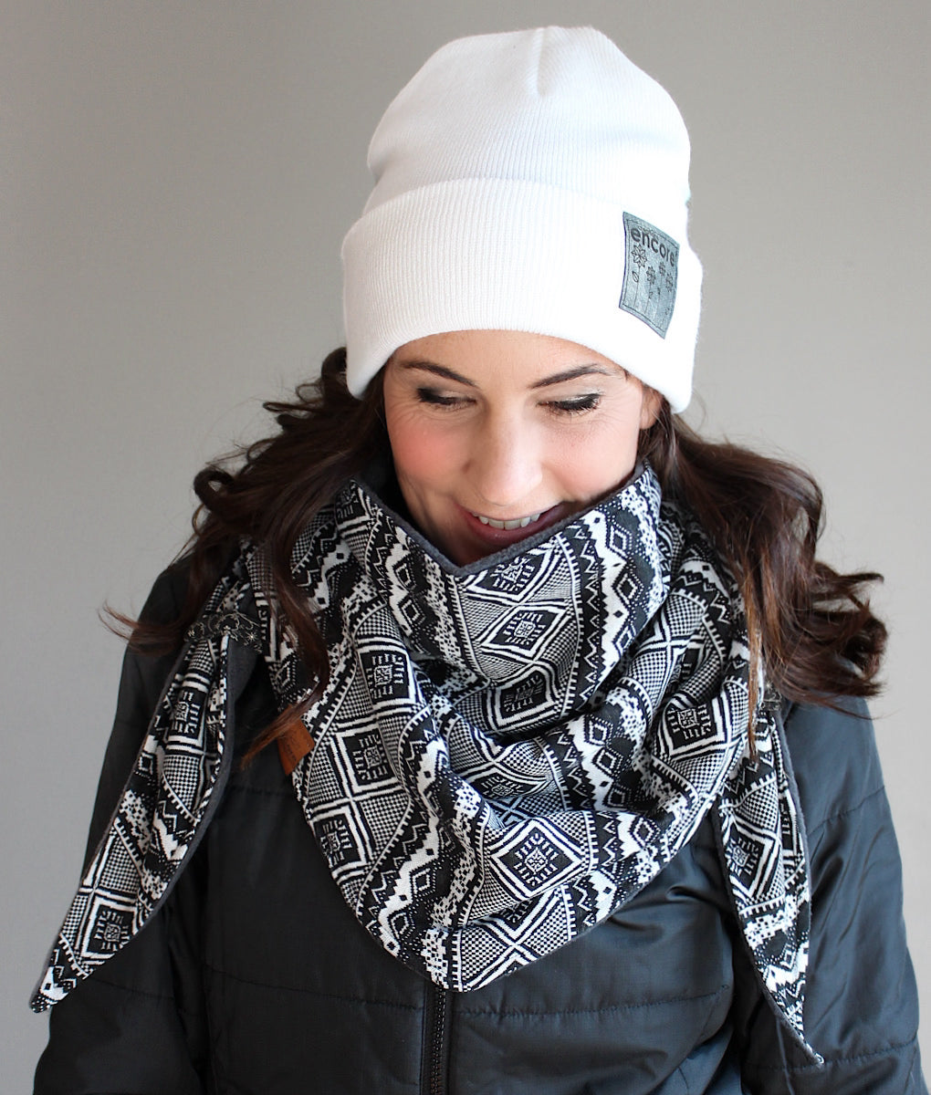 Foulard triangulaire douillet, parfait pour affronter le froid avec style. Entièrement doublé en polar pour une chaleur incomparable, son extérieur en doux tricot lui confère une allure élégante et confortable. Il suffit de croiser les pointes à l’avant et de les glisser dans les petites gances pratiques pour qu’il reste bien en place toute la journée. Un accessoire indispensable pour vous garder bien au chaud cet hiver. La tuque et les mitaines assorties sont disponibles dans la section accessoires.