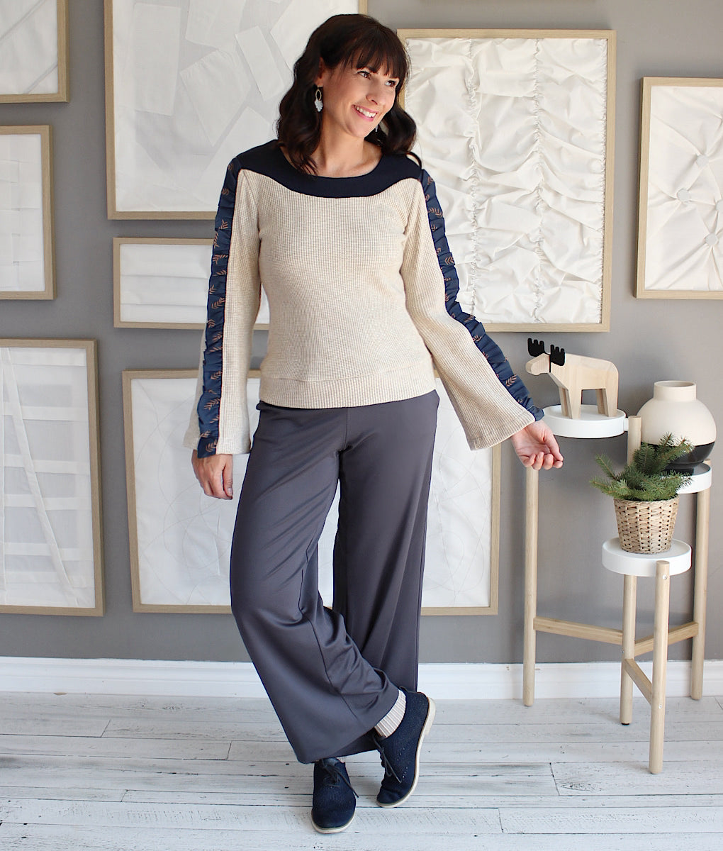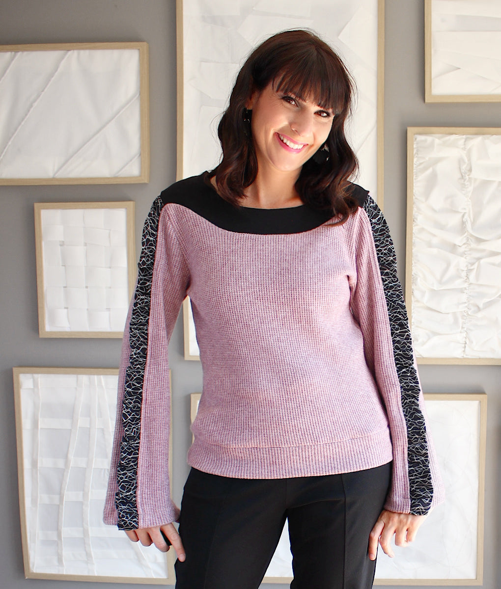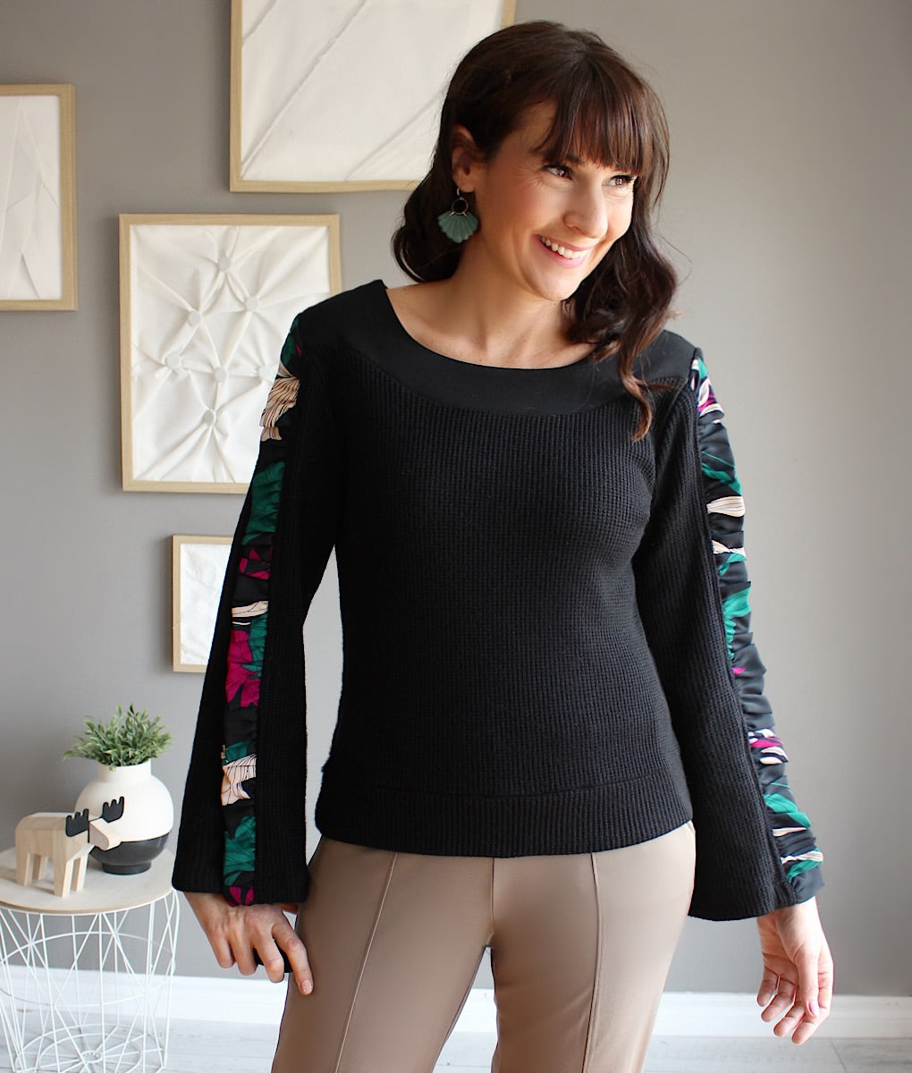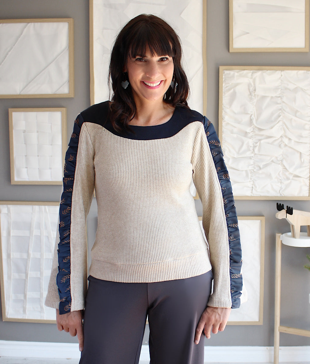 Ce top en tricot est le parfait mélange confort-chic pour l’hiver. Ses manches longues et évasées apportent élégance et aisance, tandis qu’un détail d’insertion de fronces lui donne un charme unique et sophistiqué. Le contraste des deux matières crée un effet visuel sublime, idéal pour rehausser n’importe quel look. Facile à porter en toute occasion, c’est le tricot essentiel pour rester stylée et confortable toute la saison froide. Création locale entièrement conçue au Québec.