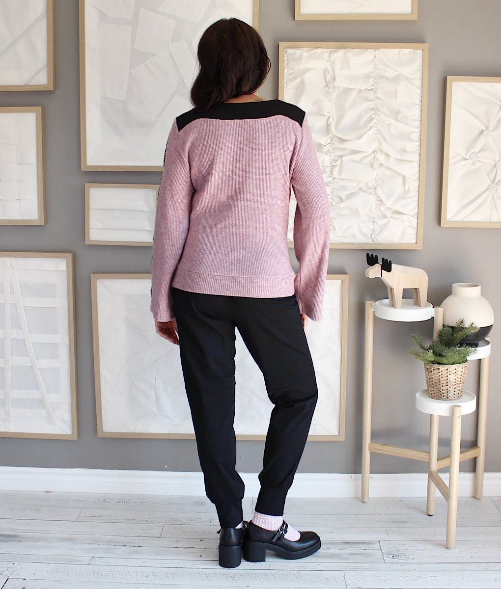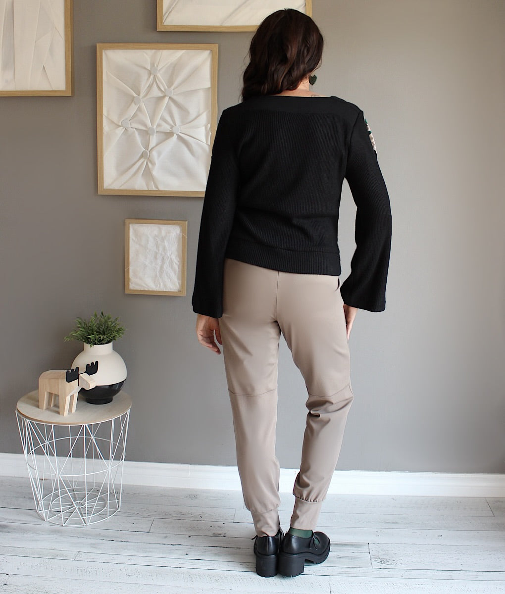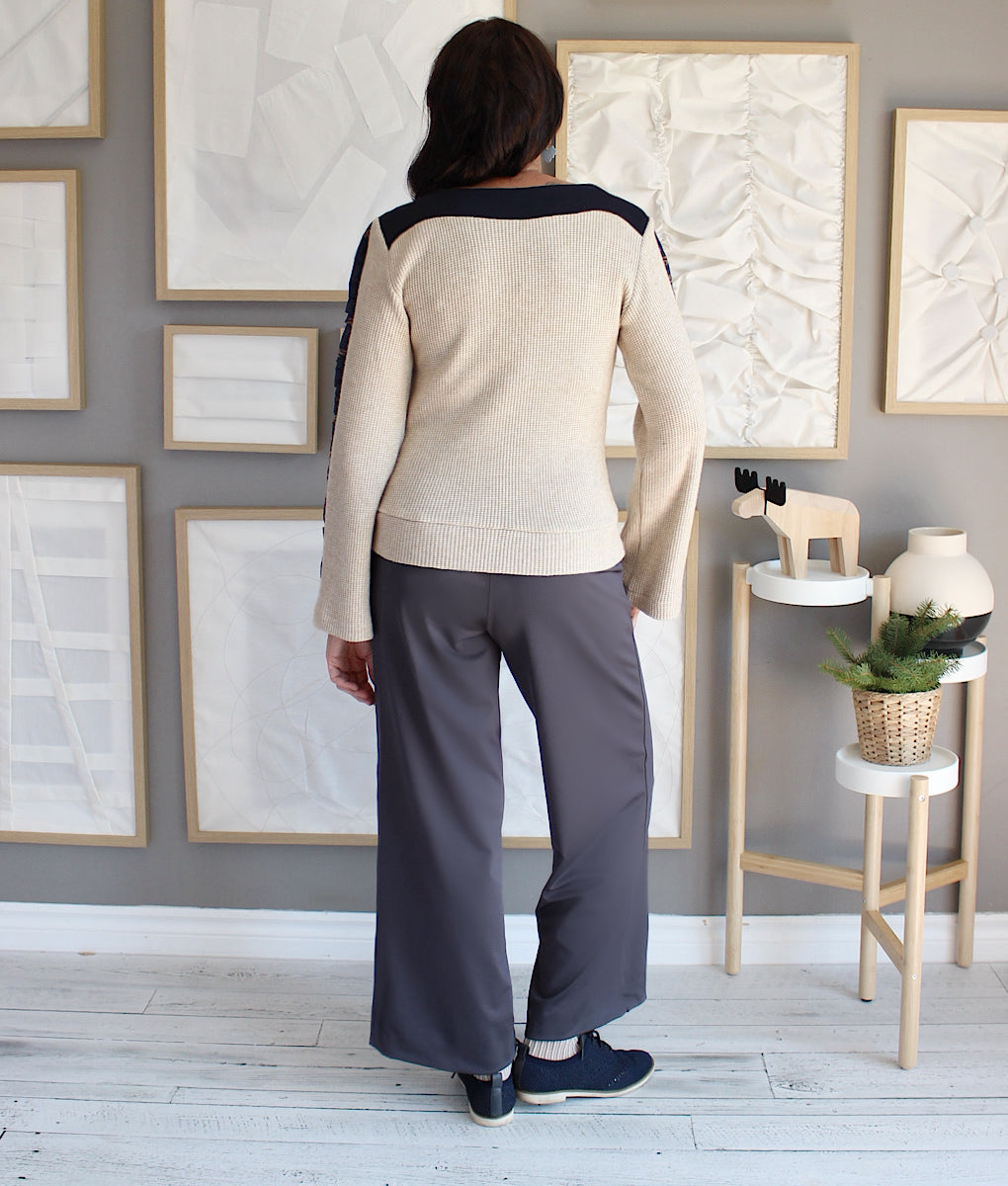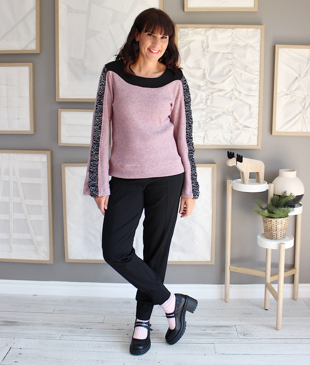 Ce top en tricot est le parfait mélange confort-chic pour l’hiver. Ses manches longues et évasées apportent élégance et aisance, tandis qu’un détail d’insertion de fronces lui donne un charme unique et sophistiqué. Le contraste des deux matières crée un effet visuel sublime, idéal pour rehausser n’importe quel look. Facile à porter en toute occasion, c’est le tricot essentiel pour rester stylée et confortable toute la saison froide. Création locale entièrement conçue au Québec.