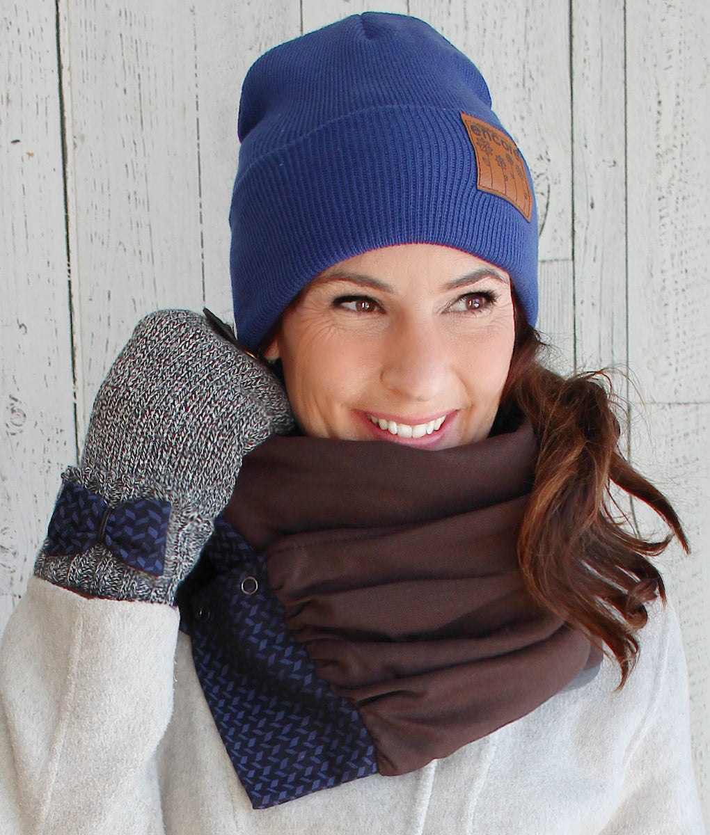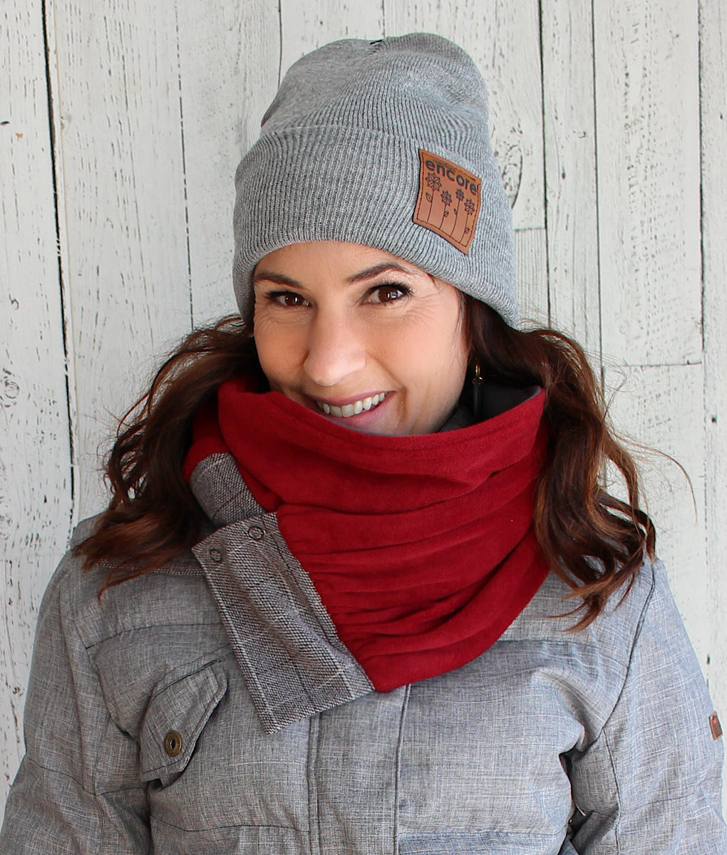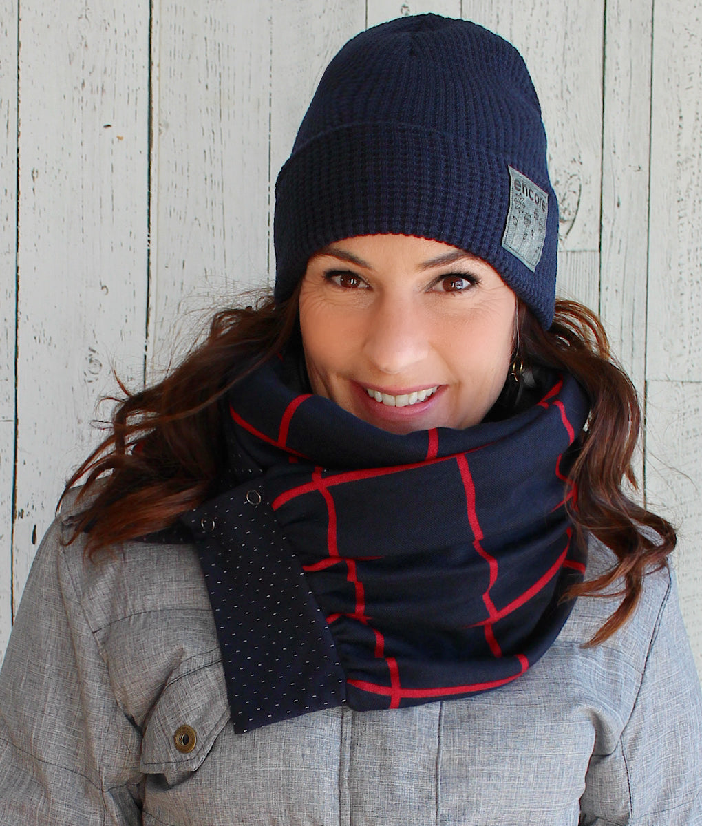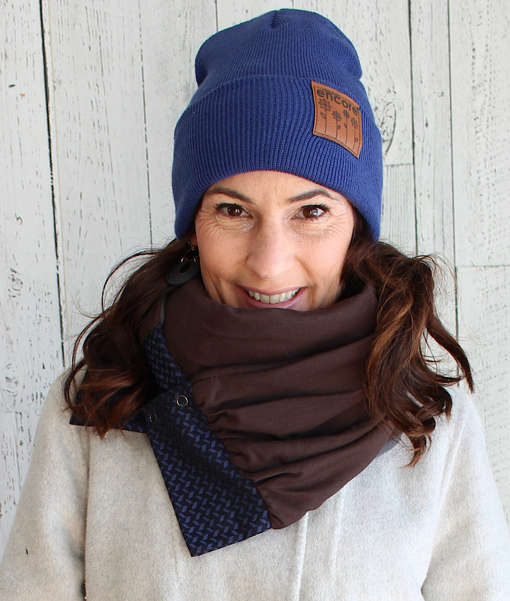 This infinity scarf, fully lined in ultra-soft polar fleece, is designed to offer you unparalleled comfort during cold days. What makes this model so beautiful is the detail of the contrasting fabric strips that surround the scarf, bringing a touch of elegance and originality to your look. Both practical and stylish, it wraps easily around your neck to keep you warm, while adding a unique touch to your winter outfits.