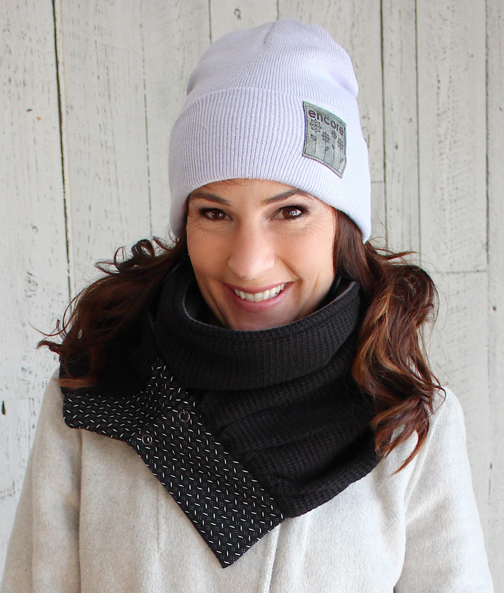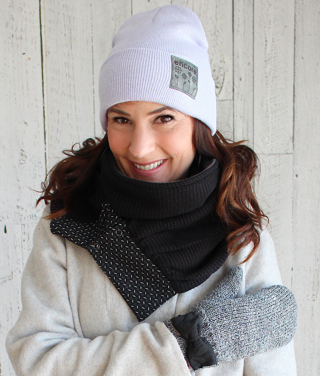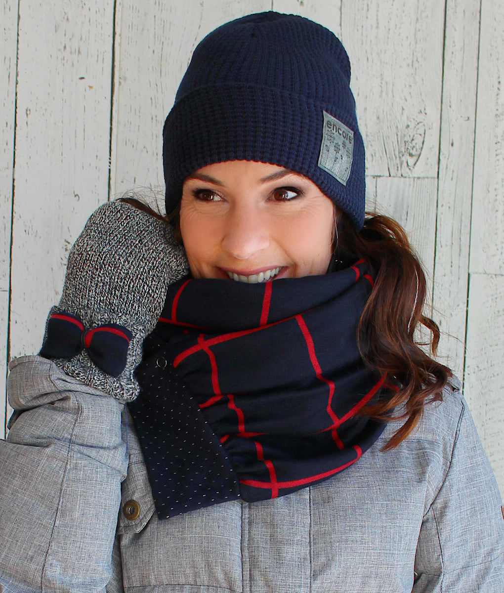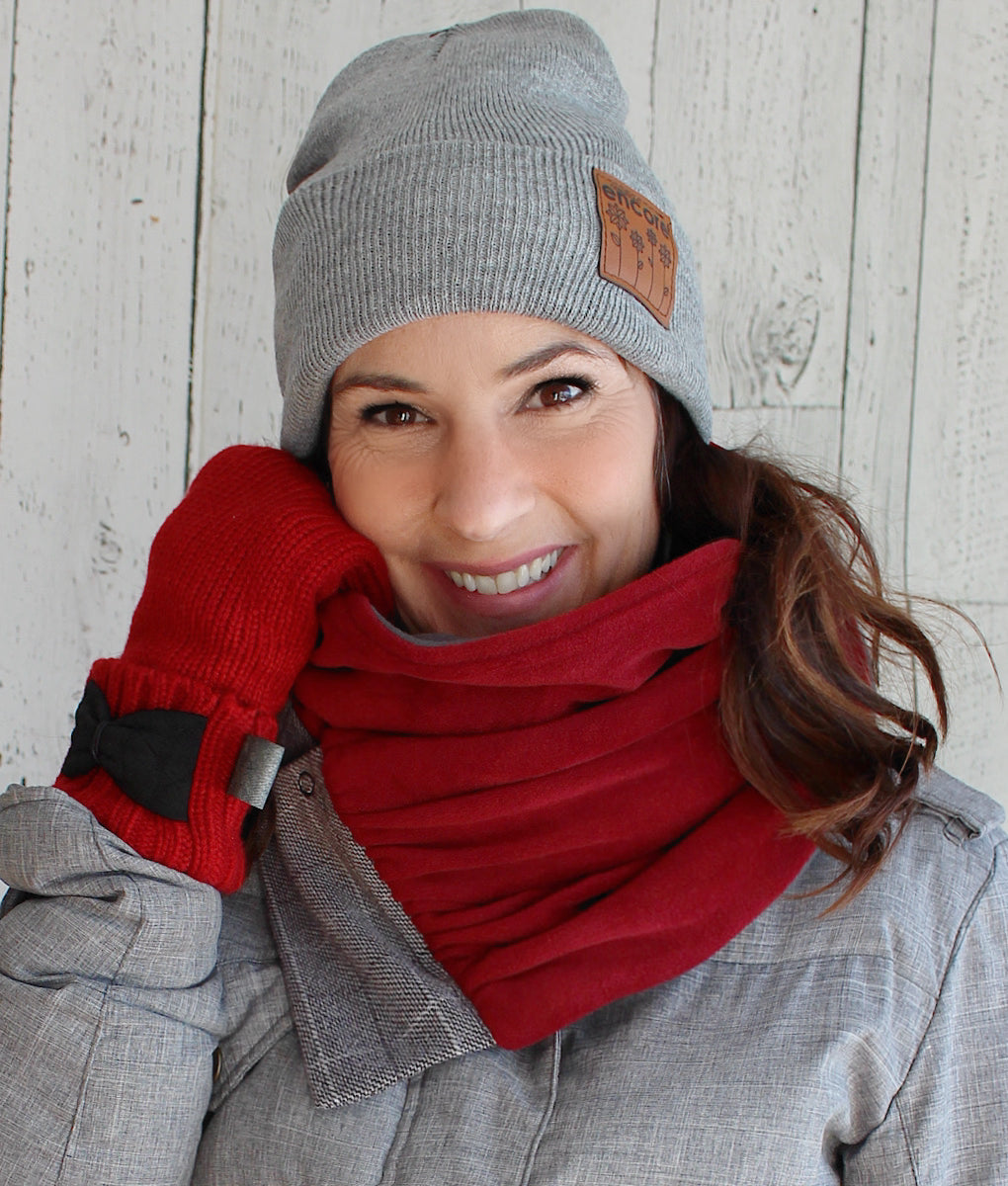 This infinity scarf, fully lined in ultra-soft polar fleece, is designed to offer you unparalleled comfort during cold days. What makes this model so beautiful is the detail of the contrasting fabric strips that surround the scarf, bringing a touch of elegance and originality to your look. Both practical and stylish, it wraps easily around your neck to keep you warm, while adding a unique touch to your winter outfits.