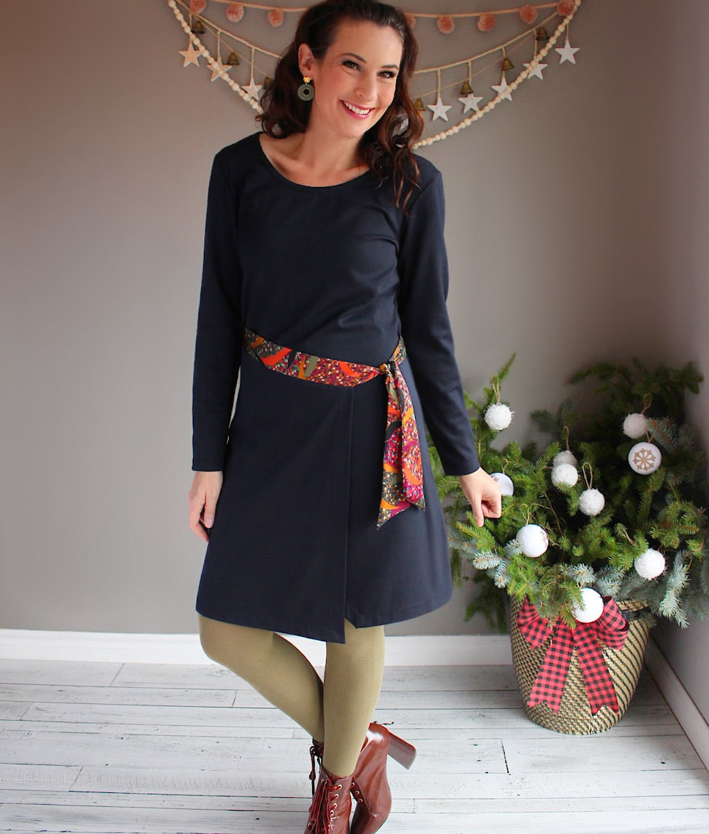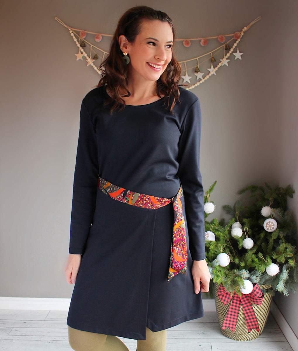 Add a touch of chic to your wardrobe with this elegant flared dress. Made from a stretchy, comfortable fabric, this dress stands out with its clean design and flattering silhouette. The detail that makes all the difference? A contrasting woven belt that highlights the waist and adds a touch of refinement to the ensemble. Ideal for all occasions, whether it's a night out on the town or a day at work, this dress combines comfort and style without compromise. All created in an eco-responsible process in Quebec!