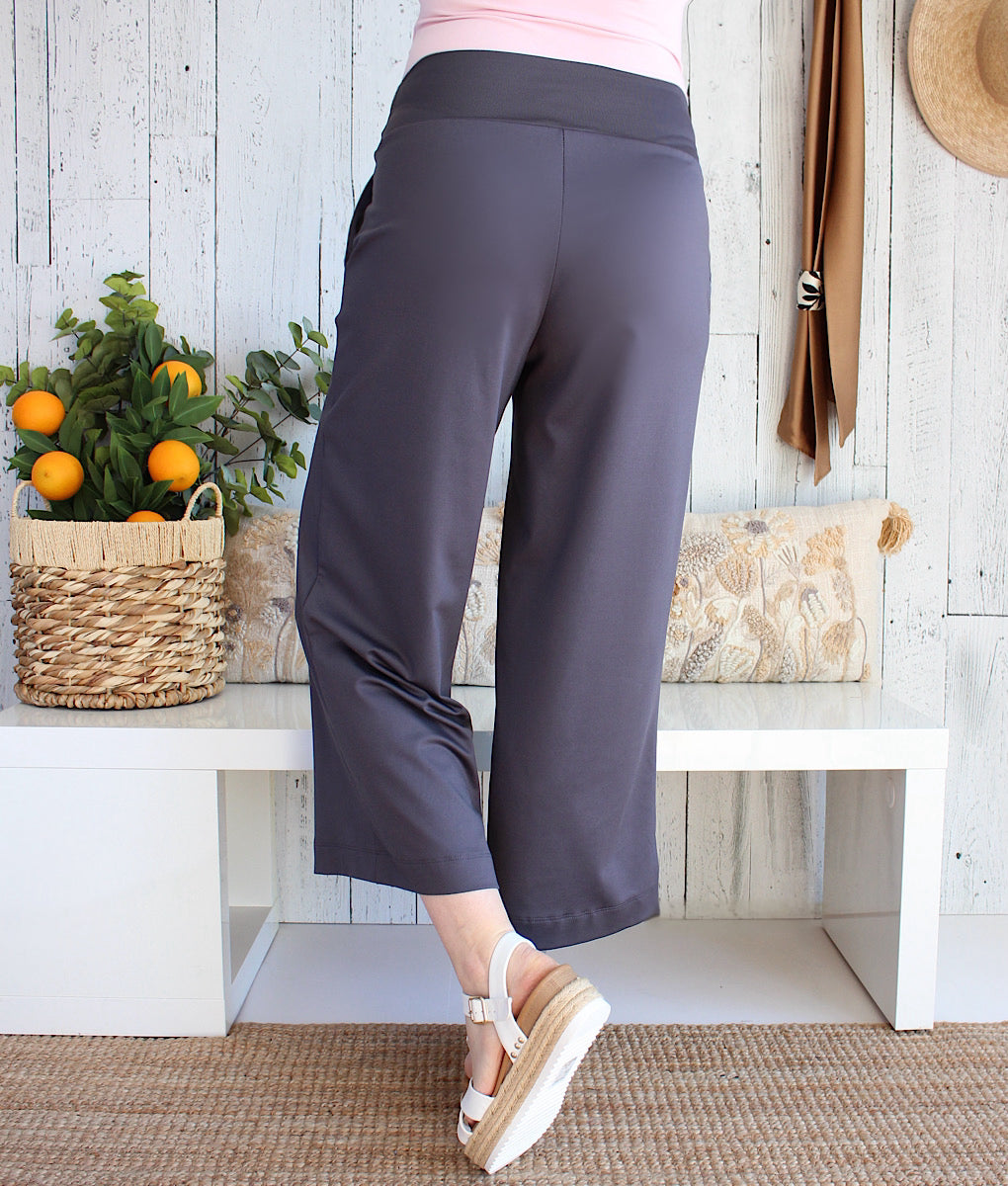 Ce pantalon présente une silhouette ample et fluide, avec des jambes larges qui se drapent élégamment autour du corps. Le tissu utilisé est doux, confortable et extensible comme un leggings permettant ainsi une grande liberté de mouvement. La taille est généralement haute pour souligner la ligne de la taille, tandis que les poches sont discrètes pour ne pas interrompre la fluidité du pantalon. Dans l'ensemble, ce pantalon est un choix sophistiqué et confortable et parfait pour le voyage puisqu’il ne froisse pas. Le tout créé dans un processus éco responsable au Québec!